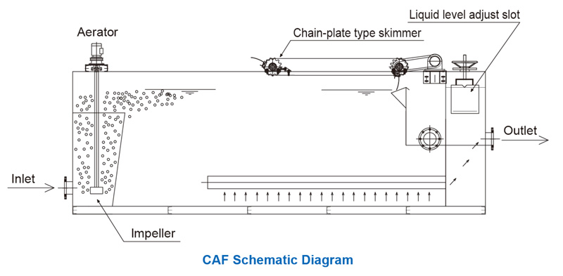 CAF (cavitation air flotation) is composed of aerator, flotation tank, skimmer and electric cabinet. The aerator will generate air bubbles through its highly speed rotating motor by way of absorbing air and then this micro bubbles will be distributed in the sludge water tank via stainless steel bulk air impeller.